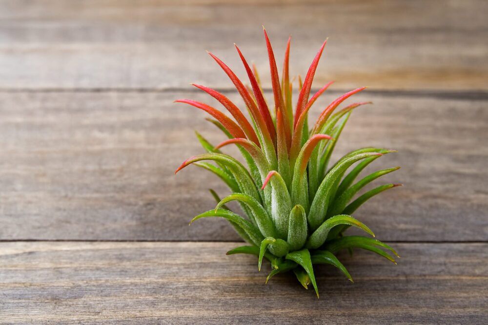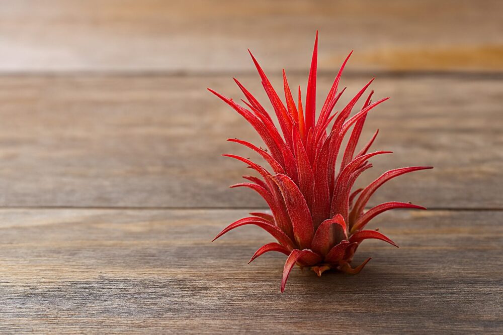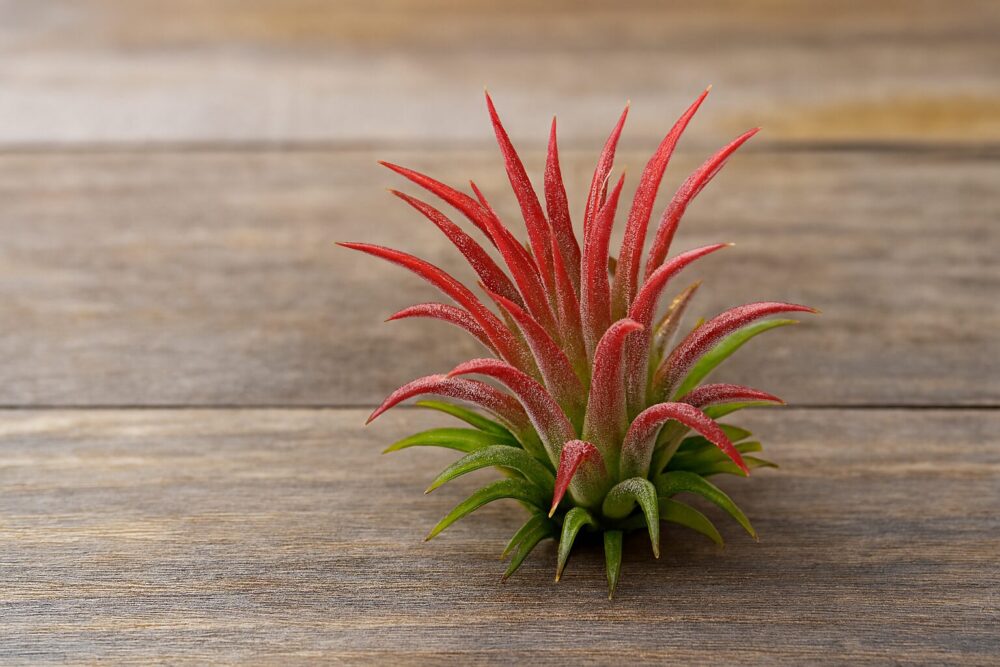- チランジア・フックシー(フクシー):細く繊細な糸状の葉がふわっと広がる姿。乾燥に強いですが、風通しを好むため置き場所の工夫がポイントになります。赤い花苞から紫の花を咲かせます。