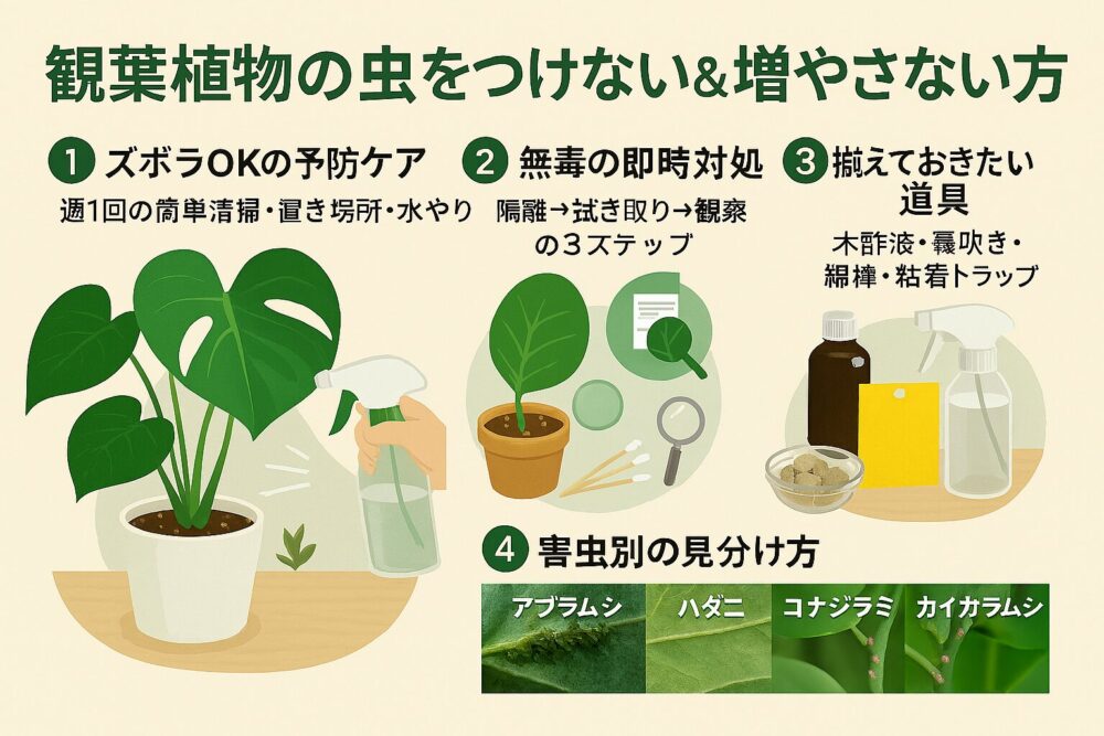 - ズボラ対応:外から持ち込む鉢や葉は帰宅後に簡単に拭く、土は新品か確認する。