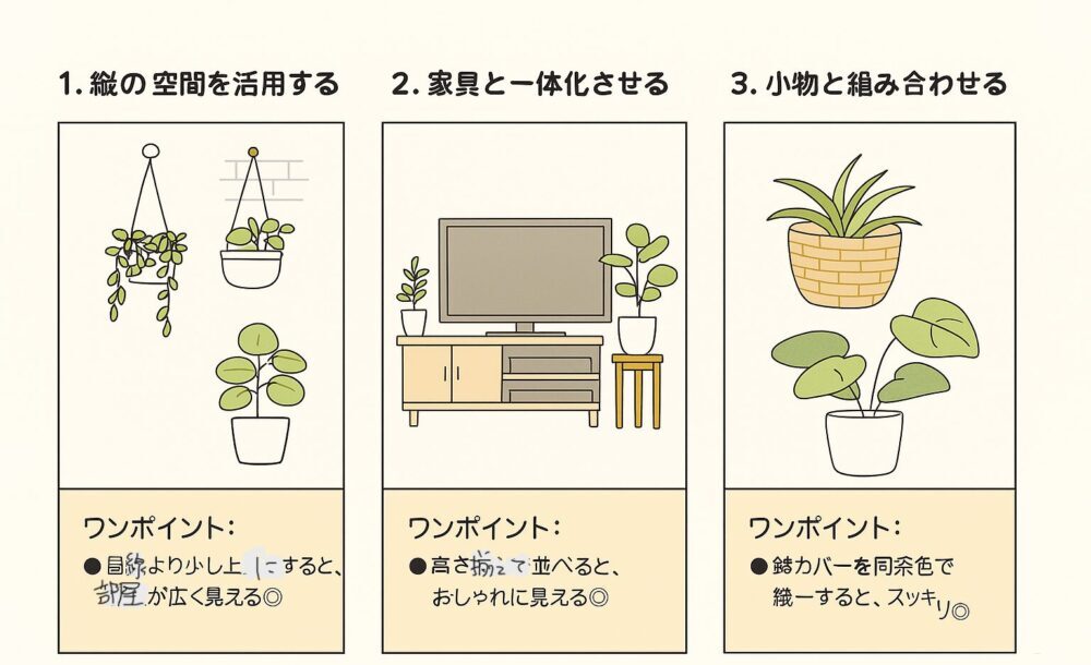 大切なのは、「自分の生活リズムに合った植物を選ぶこと」と、「置き方を工夫すること」。縦の空間を活用したり、家具と一体化させたり、ちょっとした小物を組み合わせるだけで、狭い部屋でも驚くほどおしゃれに見えます。